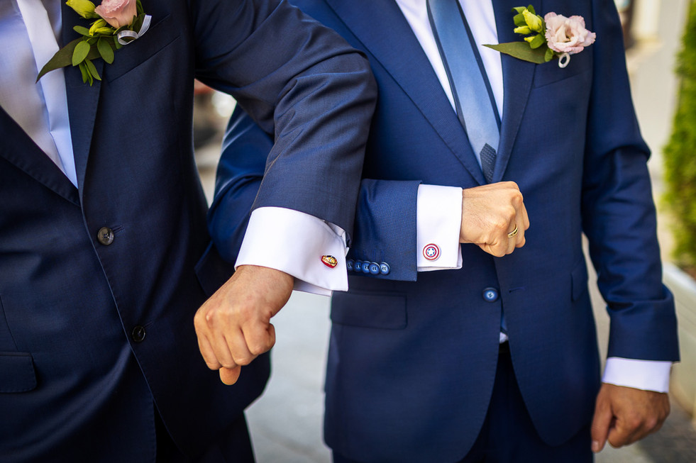 Zwróćcie uwagę na zapinki do mankietów Panów. Ekstra pomysł, prawda? Fajnie, że ludzie potrafią połączyć wyjątkową i poważna okazję z nutką szaleństwa, dzięki czemu pozostają sobą! Przed Wami, Iron Man i Kapitan Ameryka...