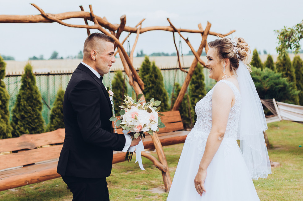 Był czas na życzenia szczęścia, miłości, liczne przytulasy i buziaki. Słońce nam nie odpuszczało ani na moment. Dopiero kiedy skierowaliśmy się do domu weselnego, z nieba zaczął padać deszcz! Uważam, że to na szczęście dla tej dwójki posypały się życzenia z góry. Zanim Młodzi przyjechali, Goście już się zgromadzili i z niecierpliwością ich pod salą wyczekiwali. Rodzice przywitali już parę jako męża i żonę... To teraz czas na co?
