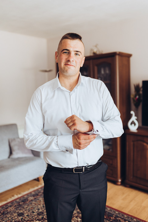 Zaczynamy od Pana Młodego i jego przygotowań. Oczywiście najpierw musiałam "zabłądzić" i dojechałam pod dom brata Szymona. Na szczęście szybki telefon i nawigacja chłopaków i trafiłam pod właściwy adres. Z Szymonem i Kasią widziałam się w grudniu kiedy podpisywaliśmy umowę i wstępnie omawialiśmy jak wygląda dzień ślubu pod względem organizacji ze strony robienia zdjęć. Ale uwierzcie, że ta godzinka dała tyle, że człowiek wysiadając z auta, czuł się tak jakby znał Pana Młodego i Świadka dłuższy czas - pełna swoboda w gadaniu i żartach - a uwierzcie, Szymon był lekko stremowany, ale pewnie dlatego, że to od niego zaczęły się zdjęcia. Aaaa i tutaj jeszcze muszę naprostować sytuację - Świadek, jak się okazało wydał mi się dziwnie znajomy... Okazało się, że świadek Szymona był świadkiem Emila - Pana Młodego z ubiegłego roku, na którego weselu także byłam fotografem. Więc już całkowicie się rozluźniała atmosfera dla wszystkich stron.