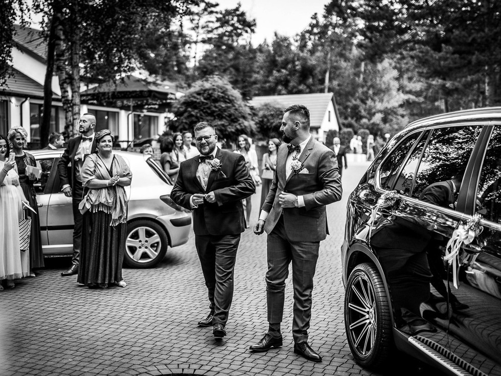 W końcu nadjechali i Oni! Czyli Świadkowie oraz Państwo Prawie Długoszek... Jak widać humory dopisują i nawet jeśli byście chcieli się doszukać stresu na ich twarzach - nie znajdziecie... Panowie byli uśmiechnięci, w wyśmienitych humorach, pięknie ubrani.